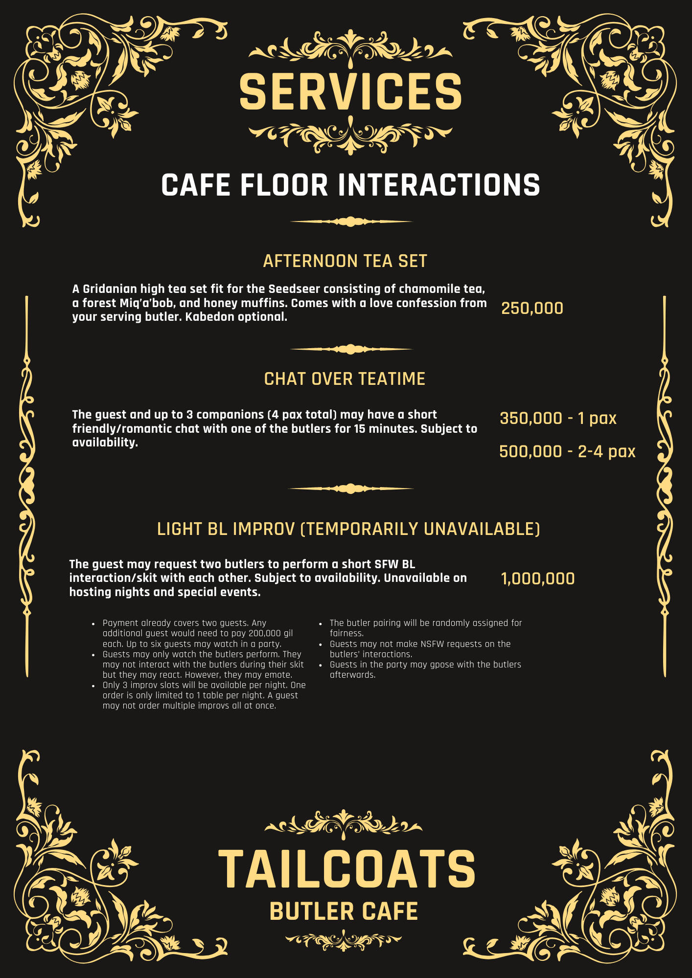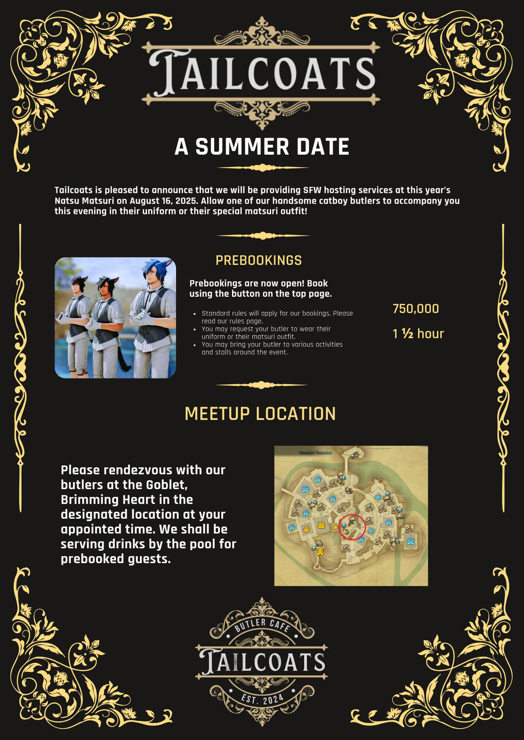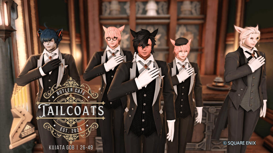 Tailcoats Butler Cafe is a SFW RP venue on Elemental staffed by handsome male Miqo'te butlers who offer 1-1 RP hosting services and afternoon tea set service.Our charming catboy butlers eagerly await your arrival!Recommended Dress Code: