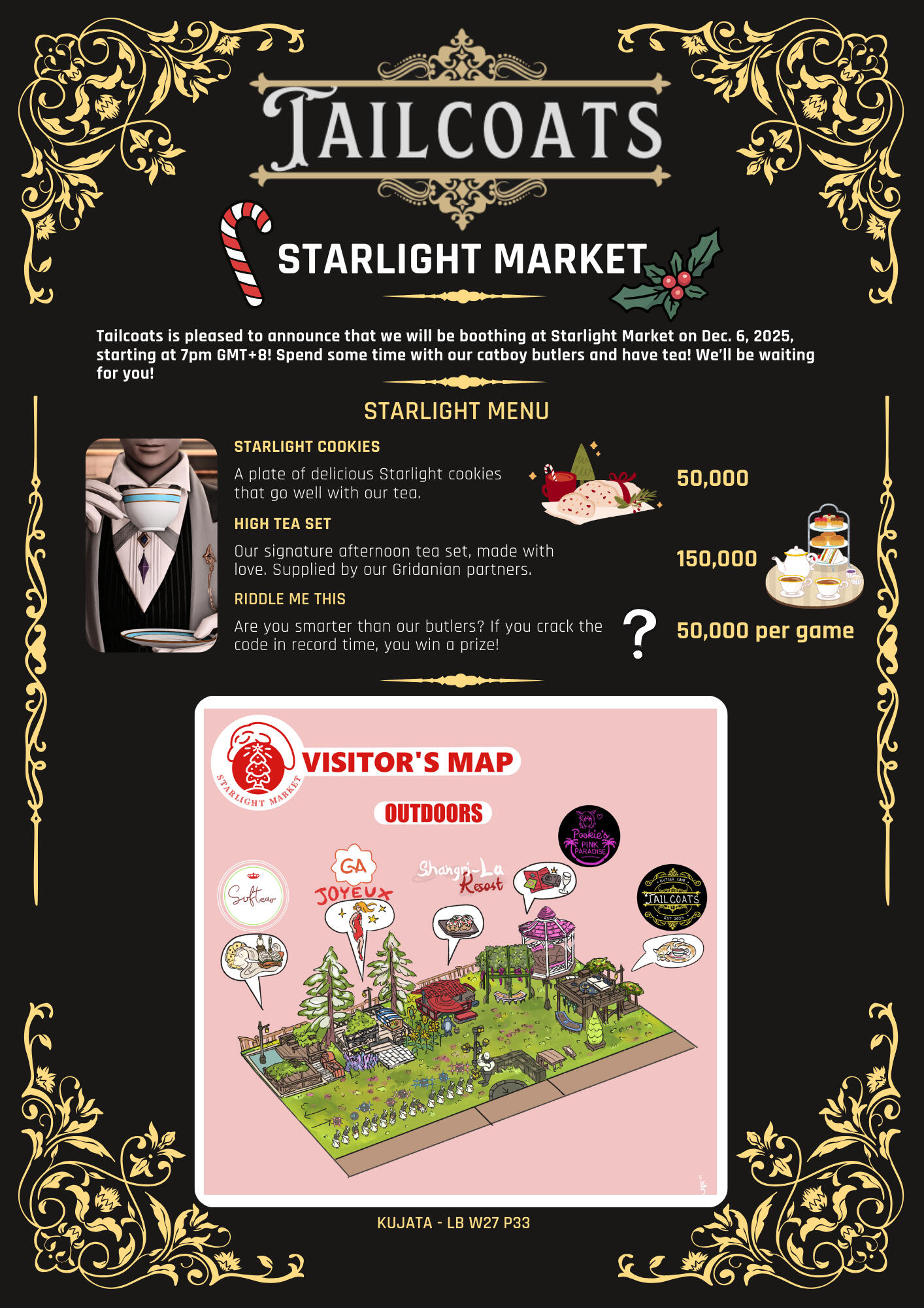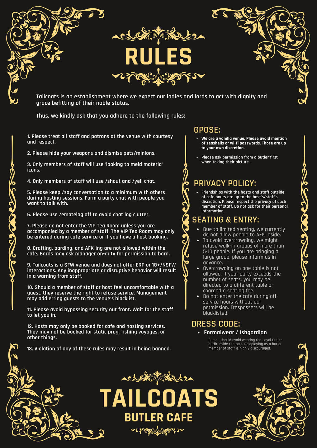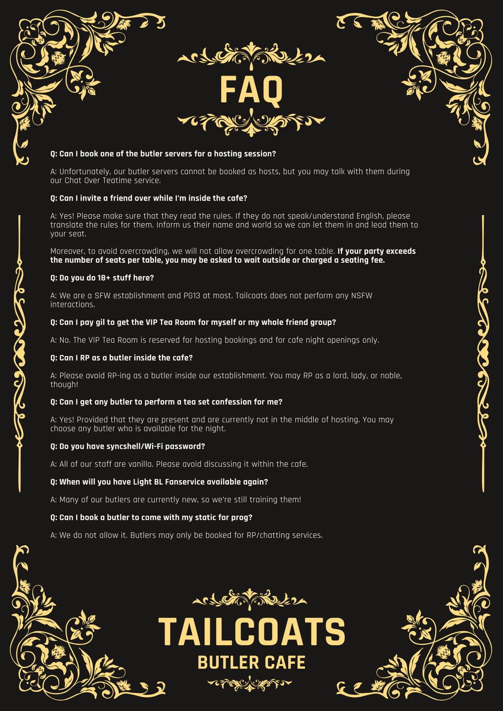 Tailcoats Butler Cafe is a SFW RP venue on Elemental staffed by handsome male Miqo'te butlers who offer 1-1 RP hosting services and afternoon tea set service.Our charming catboy butlers eagerly await your arrival!Recommended Dress Code: