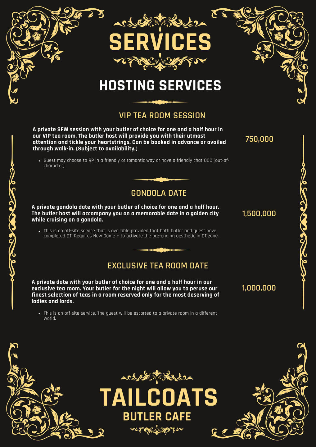 Tailcoats offers two kinds of openings every month:<Cafe Service>There are no hosting services available, but afternoon tea service is open. Guests may order afternoon tea sets from the butlers. The VIP Tea Room will be opened to guests.<Hosting Service>Both hosting services and afternoon tea service are available. Only people with bookings will be allowed to use the VIP Tea Room.