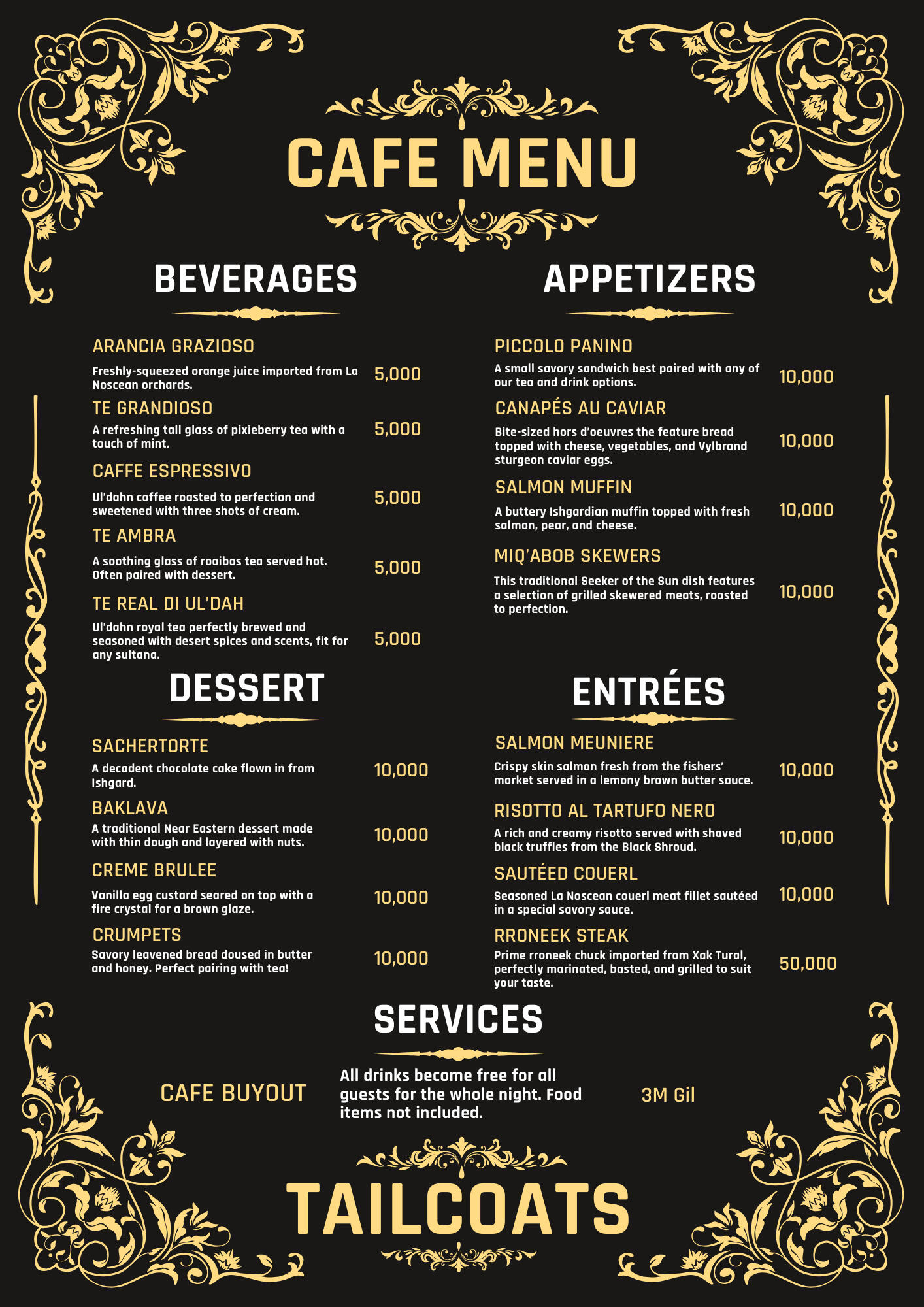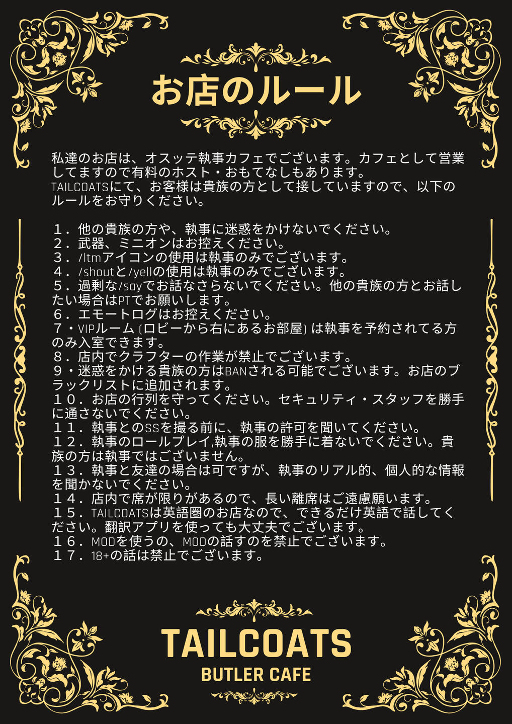 Tailcoats Butler Cafe is a SFW RP venue on Elemental staffed by handsome male Miqo'te butlers who offer 1-1 RP hosting services and afternoon tea set service.Our charming catboy butlers eagerly await your arrival!Recommended Dress Code:
